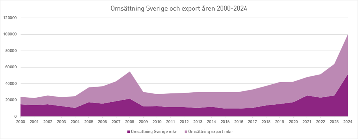 Exporten ökade med cirka 10 miljarder kronor och uppgick 2024 till över 48 miljarder kronor. Exportens andel av den totala omsättningen har samtidigt minskat till under 50 procent, vilket innebär att den svenska marknaden för första gången på över två decennier är större än exportmarknaden. Ett skäl till detta är de stora ökade leveranserna av underleverantörer till försvarsföretag i Sverige. Trots detta är Sverige fortsatt ett av världens mest internationaliserade länder sett till andelen kvalificerad teknik och kunskap i exporten.